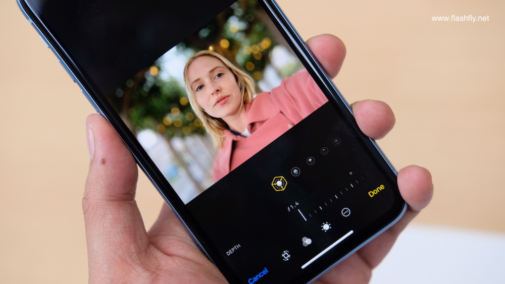 ด้านหลังมีกล้องเลนส์เดียว มาพร้อมเลนส์มุมกว้าง รูรับแสง f/1.8 ความละเอียด 12 ล้านพิกเซล และเซ็นเซอร์แบบใหม่หมด ช่วยให้ออโต้โฟกัสได้เร็วขึ้น แถมยังสามารถถ่ายในโหมดบุคคลหน้าชัดหลังเบลอได้ด้วยซอฟต์แวร์มีโบเก้ที่สวยเนียนเบลอเป็นธรรมชาติ และสามารถปรับความคมชัดของฉากหลังภายหลังได้