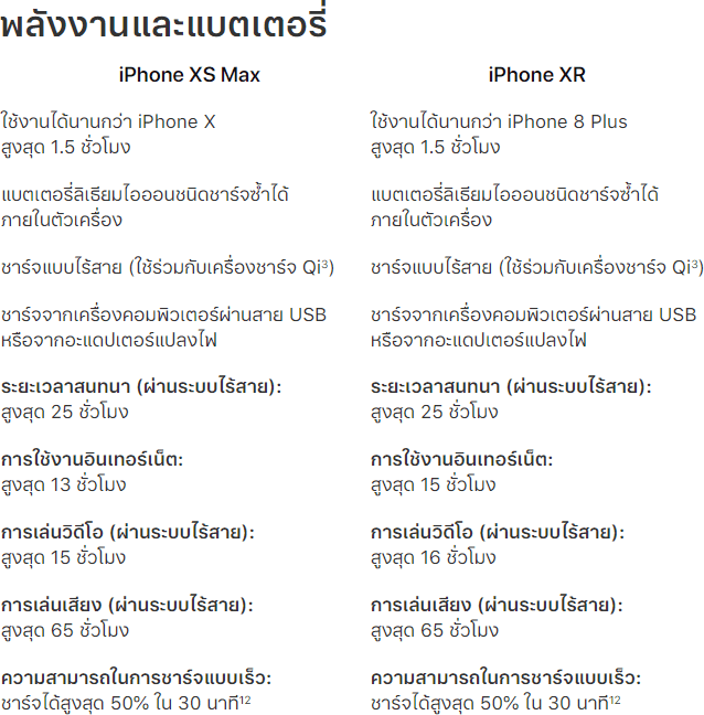 Apple ไม่ได้บอกว่า iPhone แต่ละรุ่นมีความจุของแบตเตอรี่เท่าไร แต่บอกว่า iPhone XR ใช้งานได้นานกว่า iPhone 8 Plus สูงสุด 1.5 ชั่วโมง ขณะที่ iPhone XS Max ซึ่งใช้แบตเตอรี่ก้อนใหญ่ที่สุด ใช้งานได้นานกว่า iPhone X สูงสุด 1 ชั่วโมง 30 นาที