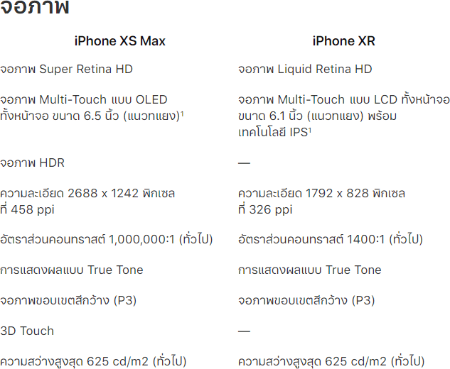 iPhone XR มีความละเอียด 1792 x 828 พิกเซล ที่ 326 พิกเซลต่อนิ้ว ส่วน iPhone XS Max มีความละเอียด 2688 x 1242 พิกเซล ที่ 458 พิกเซลต่อนิ้ว