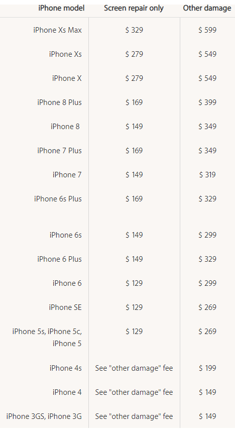 กรณีเจ้าของ iPhone ซื้อบริการ AppleCare+ จะเสียค่าซ่อมแซมจอแสดงผลเพียง 29 ดอลล่าร์สหรัฐ หรือราว 1,000 บาท และค่าซ่อมแซมความเสียหายในส่วนอื่นอยู่ที่ 99 ดอลล่าร์สหรัฐ หรือราว 3,250 บาท