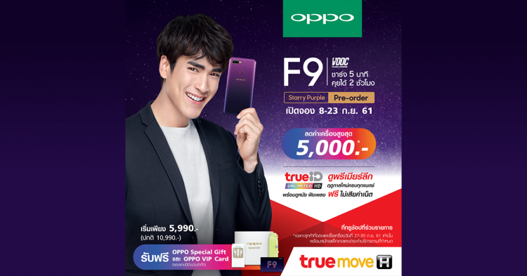 พิเศษ! ลูกค้าทรูมูฟ เอช แบบรายเดือน สั่งจอง OPPO F9 สีใหม่ Starry Purple ที่ทรูช้อปที่ร่วมรายการ ระหว่างวันที่ 8-23 กันยายน 2561 รับส่วนลดค่าเครื่องสูงสุด 5,000 บาท พร้อมสิทธิพิเศษ! ดูพรีเมียร์ลีกฤดูกาลใหม่ครบทุกแมตช์ พร้อมดูหนัง ฟังเพลงผ่าน TrueID Unlimited HD ฟรี ไม่เสียค่าเน็ต เริ่มต้นเพียง 5,990 บาท จากราคาปกติ 10,990 บาท รับฟรี OPPO Special Gift และ OPPO VIP Card (ของมีจำนวนจำกัด) เฉพาะทรูช้อปที่ร่วมรายการ
