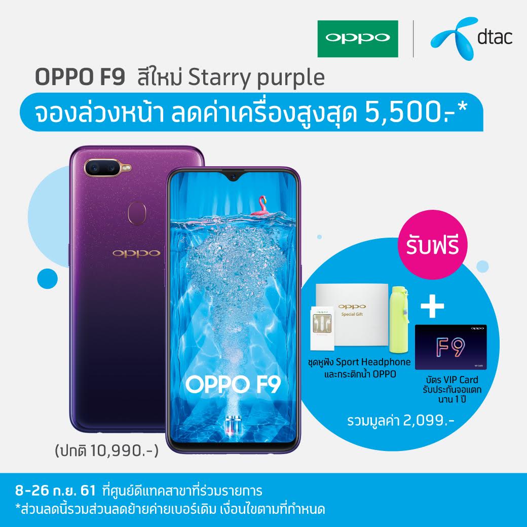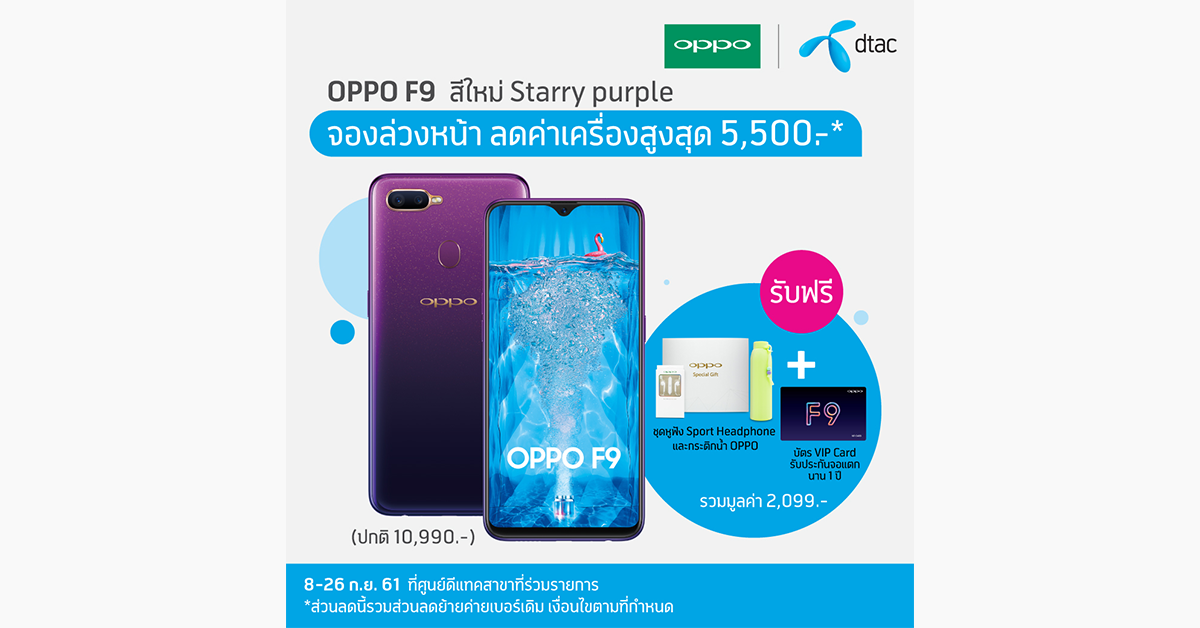 หลังจากการเปิดตัวอย่างเป็นทั้งการไปเมื่อวัน 28 สิงหาคมที่ผ่าน OPPO F9 โดยมีการจำหน่าย OPPO F9 ไปก่อนสองสี คือ Sunrise Red และ Twilight Blue และได้รับกระแสตอบรับที่ดีมากๆ ดีแทคขอมอบโปรโมชั่นสุดพิเศษ ที่สุดของข้อเสนอที่ไม่ควรพลาด! โดยสามารถสั่งจอง OPPO F9 Starry Purple Edition จากดีแทคได้แล้ววันนี้ที่dtac online store จากปกติ 10,990 บาท รับส่วนลดค่าเครื่องสูงสุด 5,500 บาท (ส่วนลดนี้รวมส่วนลดย้ายค่ายเบอร์เดิม) พร้อมรับฟรี! ของแถมสุดพิเศษประกอบด้วย ชุดหูฟังSport Headphone, กระติกน้ำ OPPO และบัตร VIP Card รับประกันจอแตก 1 ปี รวมมูลค่า 2,099 บาท ระหว่างวันที่ 8-26 กันยายน 2561 ที่ศูนย์บริการดีแทคสาขาที่ร่วมรายการ ตามเงื่อนไขที่กำหนด