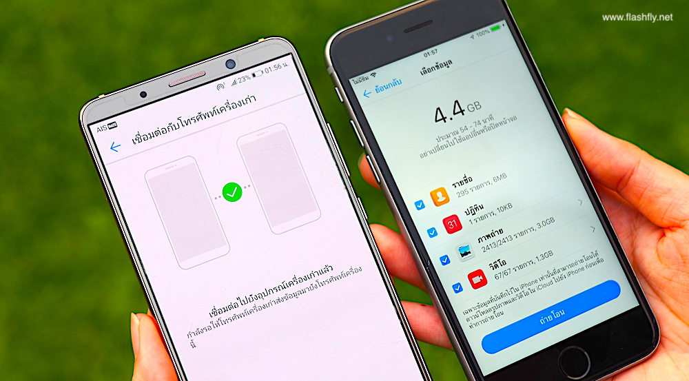 5.เมื่อพร้อมแล้วให้เราคลิกที่ปุ่ม “ถ่ายโอน” ในระหว่างโอนย้ายข้อมูล ทั้งสมาร์ทโฟน Huawei และ iPhone ก็จะมีเวลาคอยแจ้งเราว่าการโอนย้ายข้อมูลครั้งนี้ใช้เวลาประมาณเท่าไหร่ ซึ่งจากการทดสอบด้วยขนาดไฟล์ 4.4GB ในครั้งนี้ เวลาเฉลี่ยจะอยู่ 15-20 นาทีโดยประมาณ พร้อมกับมีแจ้งสถานะเปอร์เซนต์การโอนย้ายข้อมูลบอกให้เราทราบด้วย