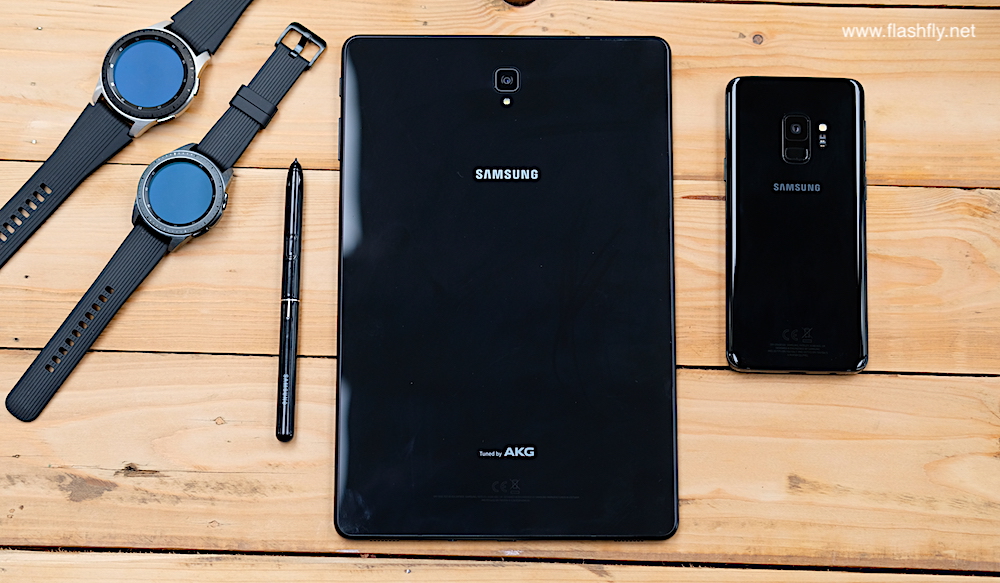 ด้านหลังจัดวางองค์ประกอบต่างๆ ไว้ตรงกึ่งกลางเหมือนกับรุ่นก่อน แต่ตำแหน่งกล้องจะอยู่ต่ำลงมา มีแฟลชอยู่ใต้เลนส์กล้อง ถัดลงมาสกรีนโลโก้ Samsung (ไม่มีโลโก้ Samsung อยู่ที่ด้านหน้าเหมือนรุ่นก่อน) และล่างสุดติดโลโก้ AKG ซึ่งรับผิดชอบคุณภาพเสียงตั้งแต่ Galaxy Tab S3