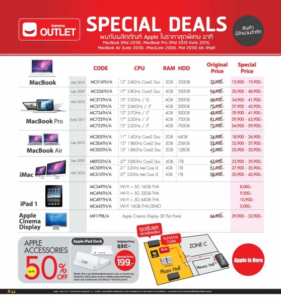 พบกับอีกหนึ่งโปรโมชั่นที่มาเอาใจลูกค้าในงาน Commart Thailand 2012 ซึ่งคราวนี้เป็นคิวของทาง Banana Outlet กันบ้างกับโปรโมชั่น Special Deals ที่ได้ขนสินค้าจาก Apple มาลดราคาแบบกระหน่ำกันเลยทีเดียว รวมถึง iPad 1 แท็ปเล็ตจาก Apple ที่มีราคาเริ่มต้นเพียง 5,000 บาทเท่านั้น