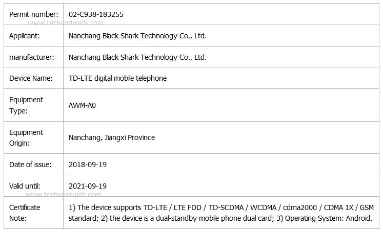ยังไม่มีความชัดเจนว่า Black Shark รุ่นที่ 2 จะใช้ชื่อ Black Shark 2 หรือไม่ แต่ข้อมูลที่ได้จากหน่วยงาน TENAA ระบุว่ามีรหัสรุ่น AWM-A0 รองรับเครือข่าย LTE สนับสนุน 2 ซิมการ์ด ทำงานบน Android ใช้จอแสดงผล 5.99 นิ้ว ความจุแบตเตอรี่ 4000mAh ขนาดบอดี้ 160 x 75.26 x 8.7 มิลลิเมตร