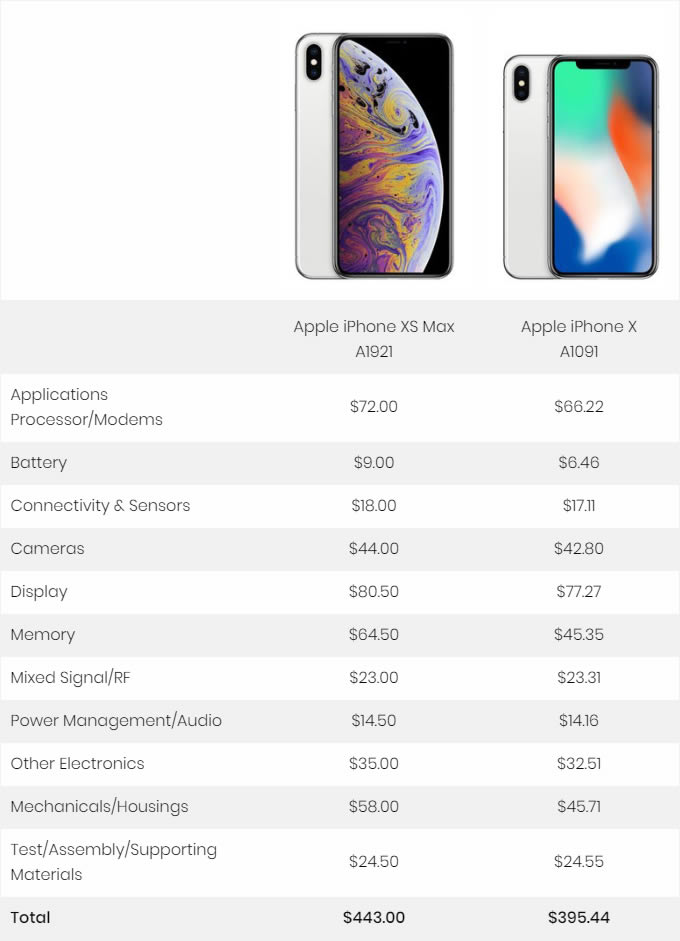 จากการชำแหละชิ้นส่วนของ TechInsights พบว่าส่วนประกอบทั้งหมดของ iPhone XS Max รุ่น 256GB มีต้นทุนประมาณ 443 ดอลล่าร์สหรัฐ หรือราว 14,400 บาท สูงกว่าต้นทุนของ iPhone X รุ่น 64GB ประมาณ 50 ดอลล่าร์สหรัฐ หรือราว 1,650 บาท