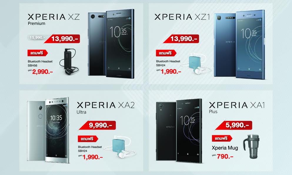 สมาร์ทโฟนเรือธงประจำปีนี้ของโซนี่ นำทัพโดย Xperia™ XZ2 Premium (27,990 บาท) โดดเด่นด้วยเทคโนโลยีสุดยอดกล้องทั้งการถ่ายภาพนิ่งและวีดีโอ โดยเป็นสมาร์ทโฟนรุ่นแรกของโลกที่ใช้กล้องระบบ Motion Eye™ Dual Camera สามารถบันทึกวีดีโอได้ด้วยความไวแสงสูงสุดที่ ISO12800 และถ่ายภาพนิ่งได้ที่ ISO51200 เมื่อซื้อในงาน รับฟรี ชุดหูฟังบลูธูท Bluetooth Headset SBH56 มูลค่า 2,990บาท อีกหนึ่งรุ่นเด่นคือ Xperia™ XZ2 สมาร์ทโฟนที่อัดแน่นด้วยเทคโนโลยีเพื่อความบันเทิงเต็มรูปแบบ ซึ่งออกแบบภายใต้คอนเซ็ปต์ “Entertainment to the Extreme” ขับเคลื่อนด้วยซีพียูที่เร็วและแรงที่สุดอย่าง Qualcomm® Snapdragon™ 845 ราคาพิเศษจาก 18,990 เหลือเพียง 16,990 บาทเท่านั้น พร้อมรับฟรี เคสสวยหรู Style Cover Touch และชุดหูฟังบลูธูท Bluetooth Headset SBH56 มูลค่า 5,760 บาท และพบกับรุ่นแฟล็กชิปจากปีที่ผ่านมาอย่าง Xperia™ XZ Premium สมาร์ทโฟนหน้าจอ 4K HDR รุ่นแรกของโลกขนาด 5.5 นิ้ว สุดยอดด้วยกล้อง Motion Eye™ และฟังก์ชั่นการถ่ายวีดีโอ Super Slow Motion 960fps นำมาลดแบบคุ้มสุดๆ เหลือเพียง 13,990 บาท พร้อมรับฟรี หูฟังบลูธูท Bluetooth Headset SBH56 มูลค่า 2,990 บาท นอกจากนี้ ยังมี Xperia™ XA2 Ultra สมาร์ทโฟนที่ล้ำหน้าด้วยกล้องหน้าเลนส์คู่มุมมอง Super wide-angle ถึง 120° ให้คุณได้ภาพเซลฟี่ที่สว่างสดใสในทุกสภาพแสง แถมเก็บภาพเพื่อนได้ยกแก๊งและวิวด้านหลังแบบเต็มซีน เสนอในราคาเพียง 9,990 บาท และรับฟรีชุดหูฟังบลูธูท Bluetooth Headset SBH24 มูลค่า 1,990 บาท และสมาร์ทโฟนรุ่นน้องประสิทธิภาพสูงราคาประหยัดอย่าง Xperia™ XA1 Plus เสนอในราคา 5,900 บาท พร้อมรับฟรี Xperia Mug มูลค่า 790 บาท