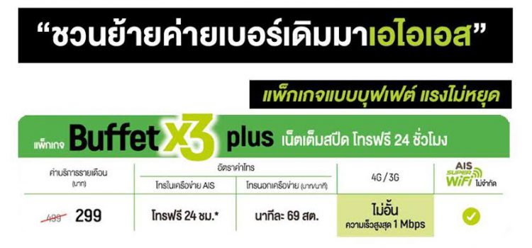 - แพ็กเกจสุดประหยัด “Buffet x3 พลัส” เพียง 299 บาท/เดือน เล่นเน็ตไม่อั้น ไม่ลดสปีด ที่ความเร็ว 1 Mbps, AIS SUPER WiFi ฟรี! และโทรฟรี! ในเครือข่ายเอไอเอส ตลอด 24ชั่วโมง เหมาะกับคนที่ต้องการเชื่อมต่อเน็ตได้ต่อเนื่องตลอดเวลา ไม่สะดุดทุกการใช้งาน