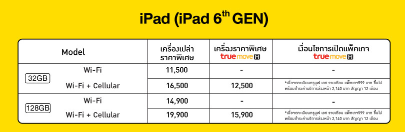 - iPad 6th Gen ราคาเริ่มต้นที่ 11,500 บาท และสำหรับหรับรุ่น WiFi+Cellular รับส่วนลดเพิ่มสูงสุด 4,000 บาท เมื่อจดทะเบียนเบอร์ทรูมูฟ เอช รายเดือน แพ็คเกจ 599 บาท ขึ้นไป พร้อมชำระค่าบริการล่วงหน้า 2,140 บาท
