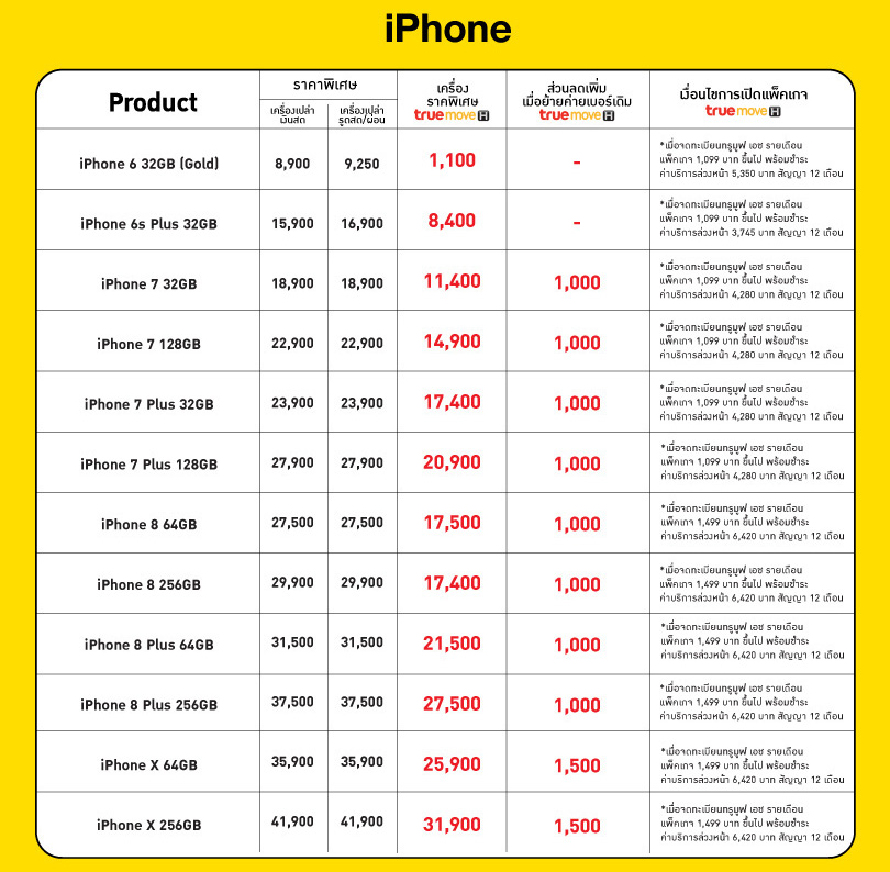 - iPhone 6 32GB สีทอง เครื่องเปล่าเงินสดเพียง 8,900 บาท จากราคาปกติ 12,900 บาท และลดเพิ่มสูงสุด 7,800 บาท เมื่อจดทะเบียนทรูมูฟ เอช รายเดือน แพ็คเกจ 1,099 บาท ขึ้นไป พร้อมชำระค่าบริการล่วงหน้า 5,350 บาท สัญญา 12 เดือน