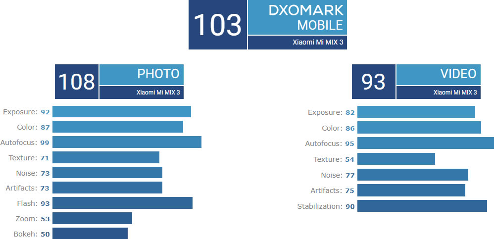 Xiaomi ปรับปรุงกล้องดิจิตอล Mi MIX 3 จนทำคะแนนได้สูงกว่ารุ่นก่อนแบบก้าวกระโดด จากการทดสอบของ DxOMark ยกให้ Mi MIX 3 มีประสิทธิภาพกล้องอยู่ในระดับเดียวกับ Samsung Galaxy Note 9 และ HTC U12+ ซึ่งมี 103 คะแนน เท่ากัน ขณะที่ Mi MIX 2S ที่เปิดตัวไปเมื่อต้นปีที่ผ่านมา ได้รับ 97 คะแนน