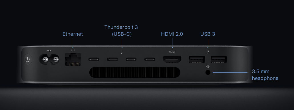 ด้วยพอร์ต Thunderbolt 3 สี่พอร์ตซึ่งมากกว่าพอร์ตในรุ่นก่อนหน้าสองเท่าและเสริมด้วยประสิทธิภาพที่เป็นสองเท่า Mac mini ใหม่จึงสามารถทำการเชื่อมต่อกับ อุปกรณ์จัดเก็บข้อมูลความเร็วสูง จอภาพ Thunderbolt ระดับ 4K และ 5K และส่งออกสัญญาณวิดีโอในสามรูปแบบ Mac mini ยังมีพอร์ต HDMI 2.0, พอร์ต USB-A 2 พอร์ต, ช่องต่อเสียง และ Gigabit Ethernet จึงทำให้สามารถเชื่อมต่อกับอุปกรณ์ต่างๆ ได้แทบทั้งหมด และด้วยประสิทธิภาพของเครือข่ายที่รวดเร็วที่สุด นี่จึงเป็นครั้งแรกที่ Mac mini มอบตัวเลือก 10Gb Ethernet