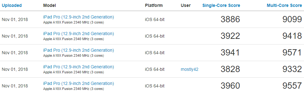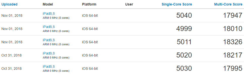 iPad Pro รุ่นใหม่ ทำคะแนนจาก Geekbench ได้ประมาณ 5030 คะแนน สำหรับ Single-Core และประมาณ 1800 คะแนน สำหรับ Multi-Core ทั้งนี้ Geekbench ระบุชื่อ iPad Pro รุ่นใหม่ว่า iPad8,8 ทำงานบน iOS 12.1 และมากับ RAM 6GB