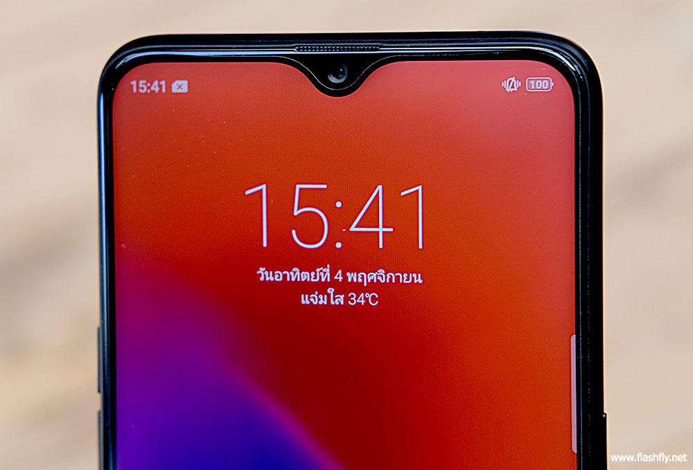 ส่วนบนของจอแสดงผลมาพร้อมรอยบากดีไซน์รูปทรงหยดน้ำค้าง ภายในรอยบากติดตั้งกล้องเซลฟี่ความละเอียด 16 ล้านพิกเซล มีเทคโนโลยี AI Beauty และฝังเซ็นเซอร์ตรวจจับแสงกับวัดระยะไว้ใต้ลำโพงหูฟังที่อยู่ชิดขอบบน