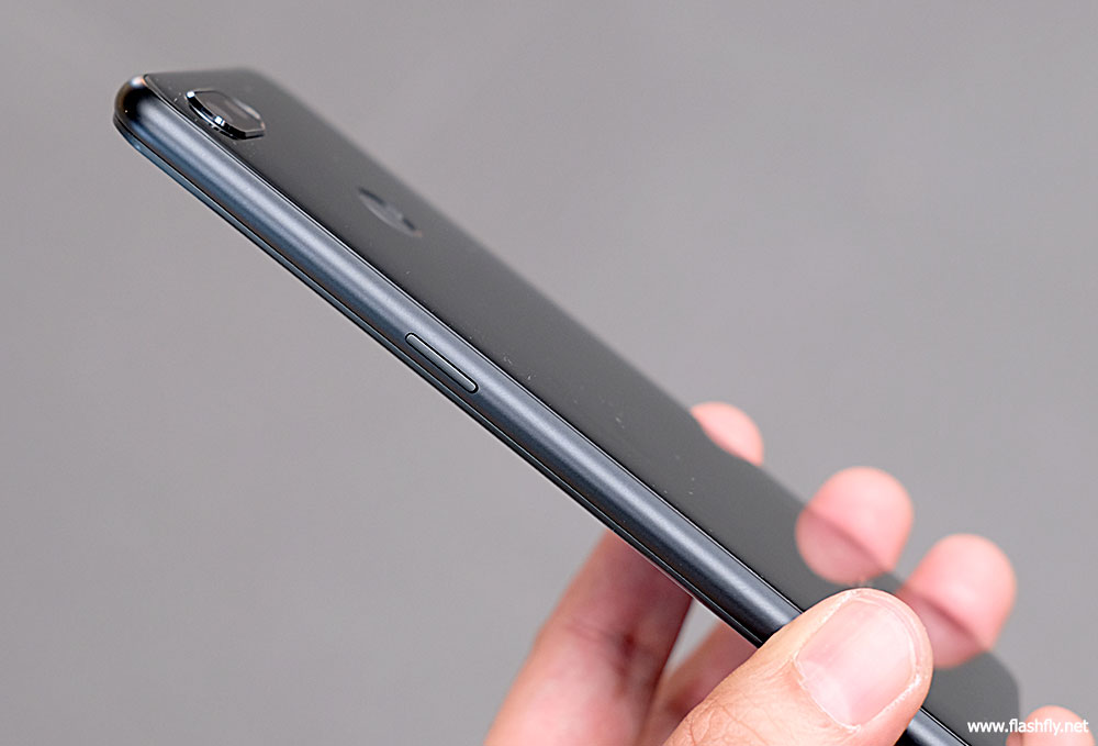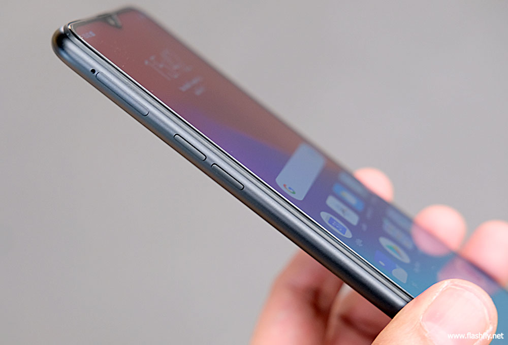 ฝั่งขวามีถาดใส่ซิมการ์ดแบ่งเป็น 3 ช่อง (ซิมการ์ดขนาดนาโน 2 ช่อง และอีกช่องสำหรับใส่การ์ด microSD ถัดลงมาเป็นปุ่มเพิ่มและลดระดับเสียง