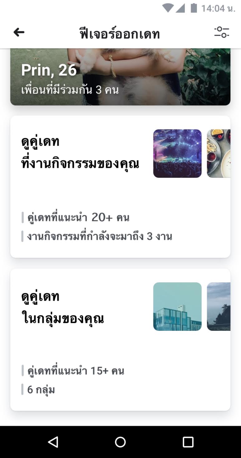 1. จับคู่จากสิ่งที่สนใจตรงกัน: คุณจะเห็นรายชื่อแนะนำซึ่งคัดเลือกมาจากความชอบและความสนใจของคุณ รวมถึงกิจกรรมของคุณบน Facebook ซึ่งจะช่วยให้คุณเชื่อมต่อกับผู้อื่นที่มีความสนใจ ตรงกันกับคุณ
