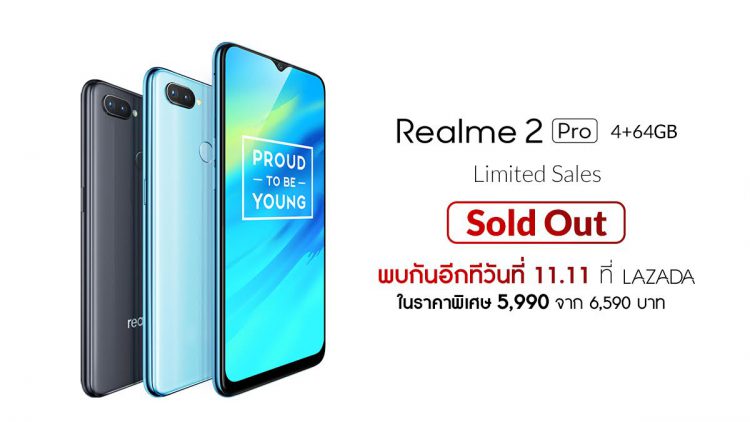 แรง!! Realme 2 Pro 4+64GB ขายหมดทันทีที่วางจำหน่าย พบกันอีกครั้ง 11 พฤศจิกายนนี้