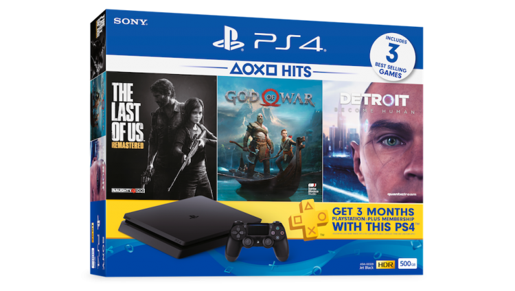 “PlayStation®4 HITS Bundle” ประกอบด้วย เครื่องเกมคอนโซล PS4™ สี Jet Black ความจุ 500GB ในราคา 11,990 บาท มาพร้อมกับเกม PS4™ จาก Sony Interactive Entertainment Worldwide Studios จำนวน 3 เกม คือ God of War™ (English/Chinese version, Disc), Detroit: Become Human™ Standard Edition (English/Chinese version, Disc) และ The Last of Us™ Remastered (English version, Digital)