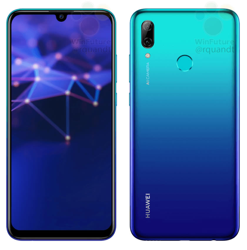 สมาร์ทโฟน Huawei P Smart 2019 ถูกปล่อยภาพหลุดออกมาเป็นครั้งแรก ซึ่งมีการออกแบบคล้ายกับ Honor 10 Lite ที่เปิดตัวในประเทศจีน มาพร้อมจอแสดงผล 2340 x 1080 พิกเซล ขนาด 6.2 นิ้ว อัตราส่วนภาพ 19.9:9 มีรอยบากบนขอบจอเพื่อเว้นไว้ติดตั้งกล้องเซลฟี่ และมีให้เลือกอย่างน้อย 2 สี คือ Midnight Black และ Aurora Blue