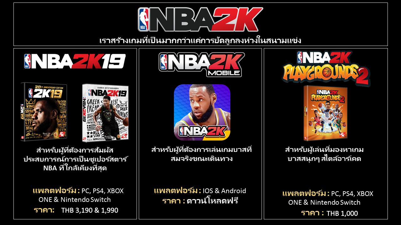 NBA 2K Mobile คือ หนึ่งในสมาชิกใหม่ของเกมตระกูล NBA 2K ที่มีเกมอย่าง NBA 2K19 และ NBA 2K Playgrounds 2 โดย NBA 2K19 คือเกมสำหรับผู้ที่ต้องการสัมผัสประสบการณ์การเป็นซูเปอร์สตาร์ NBA ที่ใกล้เคียงที่สุด ขณะที่ NBA 2K Playgrounds 2 คือเกมสำหรับผู้เล่นที่มองหาเกมบาสสนุกๆ สไตล์อาร์เคด ทั้ง NBA 2K19 และ NBA 2K Playgrounds 2 มีให้เล่นแล้วทั้งแบบดิจิทัลดาวน์โหลดและแบบแผ่นดิสก์ ในเครื่อง Xbox One,PlayStation®4, Nintendo Switch และแบบดิจิทัลสำหรับ Windows PC
