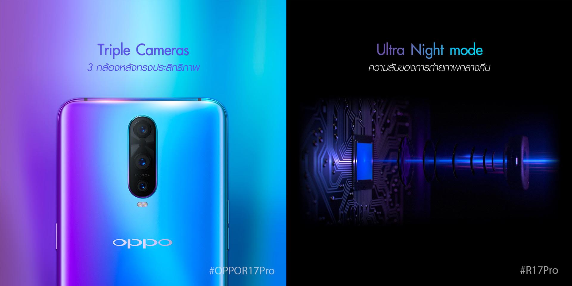 โดย OPPO R17 Pro มาพร้อมเทคโนโลยีกล้อง TOF 3 มิติ ชูจุดเด่นด้วย Ultra Night Mode กล้องหลัก 12 ล้านพิกเซล ที่มีรูรับแสงอัจฉริยะ F1.5/F2.4 พร้อมทั้ง AI Ultra-Clear Engine ที่ช่วยประมวลผลภาพให้ออกมาสวยคมชัด และยังมี OIS ระบบป้องกันการสั่น ช่วยให้การการถ่ายภาพในตอนกลางคืนนั้นนิ่งและง่ายขึ้น
