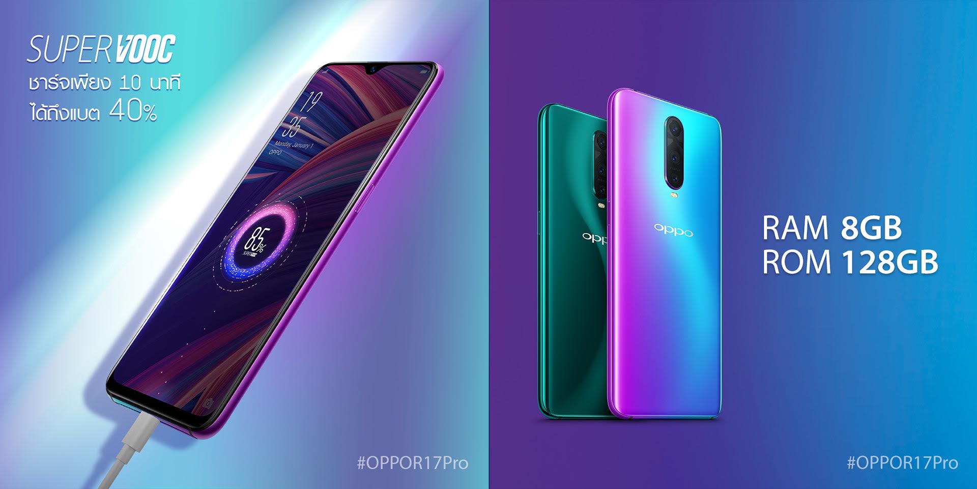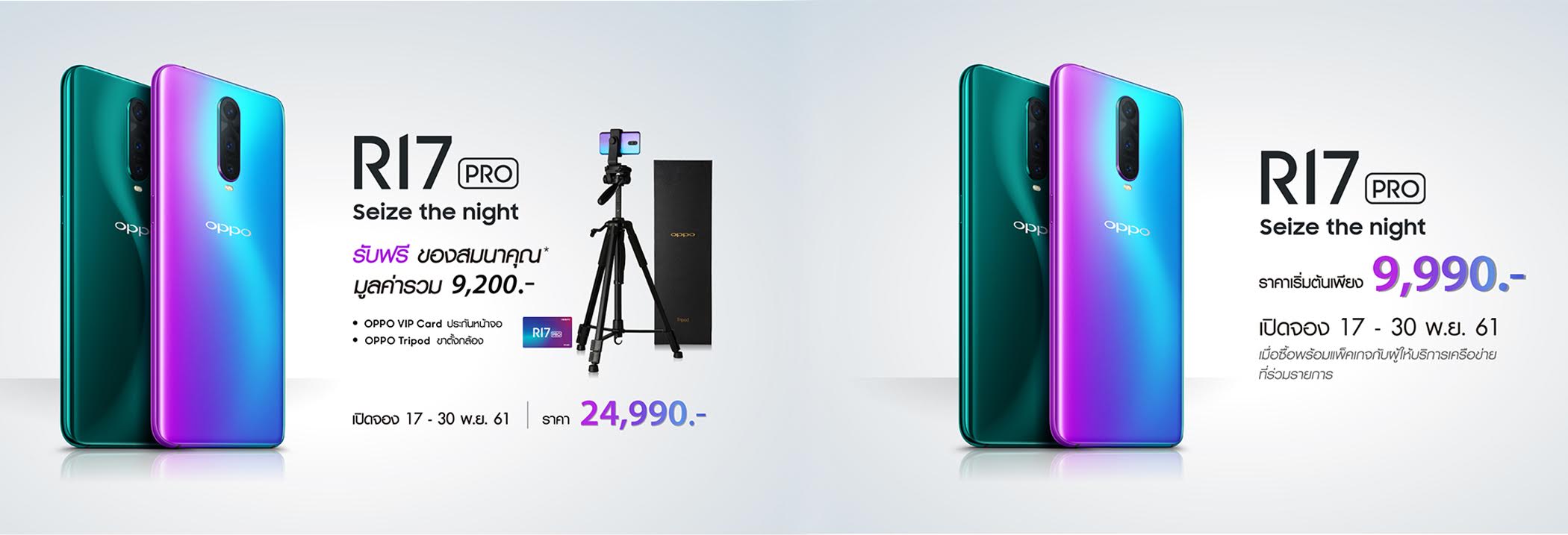 ร่วมสัมผัสที่สุดแห่งนวัตกรรมจาก OPPO R17 Pro สมาร์ทโฟนที่ผสานเทคโนโลยีล้ำสมัย และดีไซน์สุดสร้างสรรค์ พร้อมสัมผัสประสบการณ์ทรงพลังเพียงปลายนิ้วสัมผัส ในราคา 24,990 บาท สั่งจองได้แล้ว ตั้งแต่วันนี้ถึง 30 พฤศจิกายนนี้ พร้อมรับของสมนาคุณ OPPO VIP Card และ OPPO Tripod มูลค่ารวม 9,200 บาท และจำหน่ายวันแรกพร้อมกันที่ OPPO Brand Shop และร้านค้าชั้นนำทั่วประเทศ ตั้งแต่วันที่ 1 ธันวาคมนี้ เป็นต้นไป
