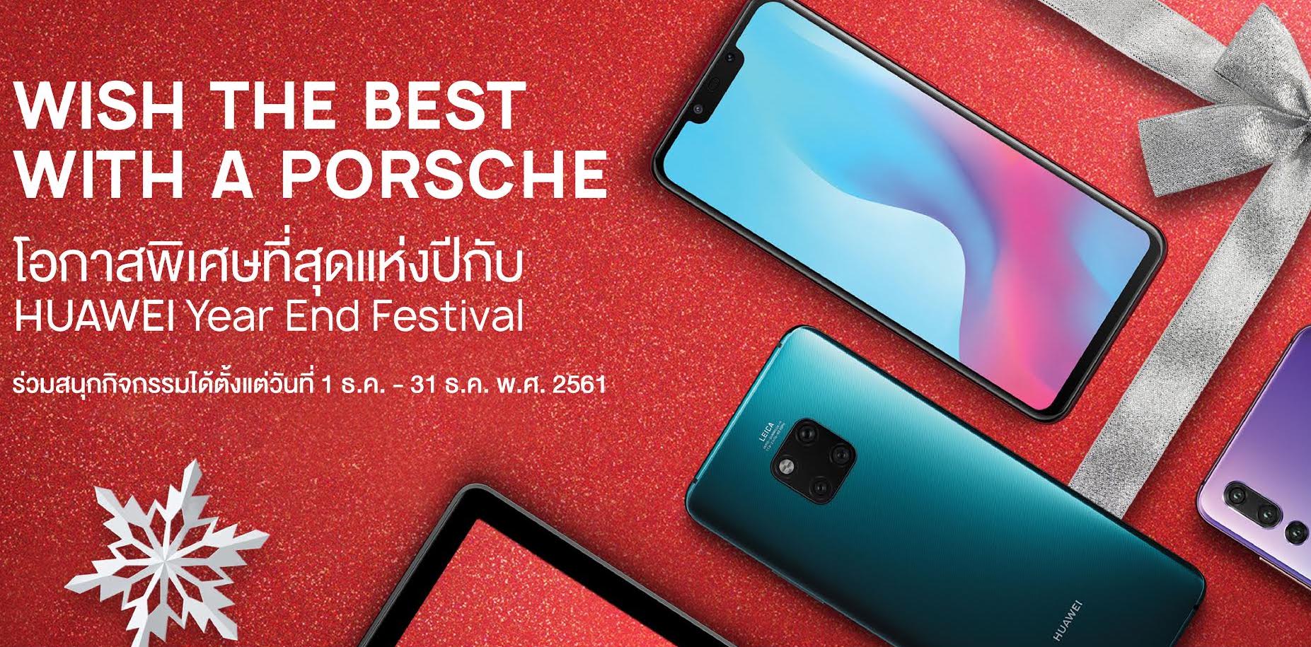 หัวเว่ยจัดแคมเปญส่งท้ายปี “HUAWEI Year End Festival” ต้อนรับเทศกาลแห่งการให้ จัดสมาร์ทโฟนและแท็บเล็ตรุ่นยอดฮิตมาลดแลกแจกแถม พร้อมมอบของขวัญสุดพรีเมี่ยมรวมมูลค่ารวมทั้งสิ้นกว่า 8 ล้านบาท เมื่อซื้อโทรศัพท์มือถือหรือแท็บเล็ตหัวเว่ยรุ่นใดก็ได้ ลุ้นเป็นเจ้าของรางวัลใหญ่ รถสปอร์ต Porsche 718 Cayman สี Black Metallic จำนวน 1 รางวัล มูลค่า6,600,000 บาท พร้อมลุ้นรางวัลสมาร์ทโฟนหัวเว่ยสุดหรู อย่าง HUAWEI Porsche Design Mate RS ทุกสัปดาห์ จำนวน 31รางวัล มูลค่ารางวัลละ 54,990 บาท ตั้งแต่วันที่ 1 – 31 ธันวาคมนี้เท่านั้น!
