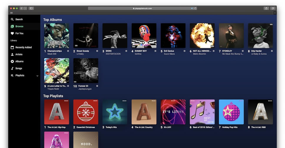 ภายในเว็บไซต์ playapplemusic.com จะพบกับอัลบั้มเพลงต่างๆ ที่มีอยู่บน Apple Music แต่ผู้ใช้งานจะต้อง Log in เข้าสู่ระบบด้วยบัญชี Apple ID จึงจะสามารถเล่นเพลงเหล่านั้นได้