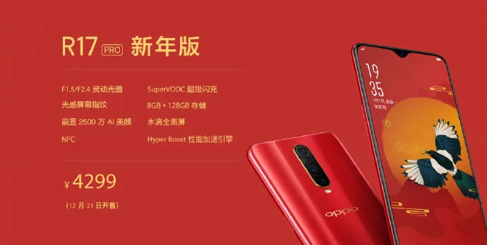 OPPO R17 New Year’s Edition มากับจอแสดงผล AMOLED Full HD+ (2340 x 1080 พิกเซล) ขนาด 6.4 นิ้ว ใช้ชิปประมวลผล Qualcomm Snapdragon 670 ความจำ RAM 6GB จับคู่กับ ROM 128GB กล้องเซลฟี่ 25 ล้านพิกเซล กล้องคู่หลัง 16 + 5 ล้านพิกเซล ความจุแบตเตอรี่ 3,500mAh และรองรับเทคโนโลยีชาร์จเร็ว VOOC Flash Charge ราคา 2,799 หยวน หรือราว 13,310 บาท
