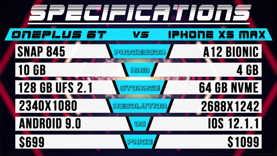 OnePlus 6T McLaren Edition มีสเปกโดยรวมเหมือนกับรุ่น OnePlus 6T แต่อัพเกรดความจำมากับ RAM 10GB ทำงานบนพื้นฐาน Android Pie ราคา 699 ดอลล่าร์สหรัฐ หรือราว 22,830 บาท ขณะที่ iPhone XS Max มากับ RAM 4GB ทำงานบน iOS 12.1.1 ราคาเริ่มต้น 1,099 ดอลล่าร์สหรัฐ (ในประเทศไทยเริ่มต้นที่ 43,900 บาท)