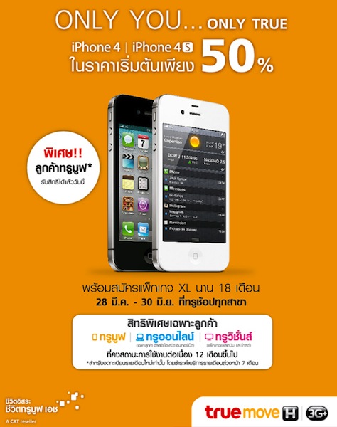 ทรูมูฟ เอช ผู้นำบริการ 3G ตัวจริง และผู้นำด้านสมาร์ทโฟน ประกาศขยายสิทธิพิเศษและความคุ้มค่าของแคมเปญ “Only You…Only True” ให้ลูกค้าทรูมูฟแบบรายเดือนที่คงสถานะการใช้งานต่อเนื่อง 12 เดือนขึ้นไป เป็นเจ้าของ iPhone 4S หรือ iPhone 4 ในราคาโดนใจ เริ่มต้นเพียง 50% เมื่อเปิดเบอร์ทรูมูฟ เอช ใหม่พร้อมสมัครแพ็กเกจ XL 899 นาน 18 เดือน พิเศษ! รับสิทธิผ่อน 0% นานสูงสุด 6 เดือน กับบัตรเครดิตที่ร่วมรายการ พร้อมขยายเวลารับสิทธิ์สำหรับลูกค้าอัลตร้า ไฮ-สปีด อินเทอร์เน็ต จากทรูออนไลน์ และลูกค้าทรูวิชั่นส์ แพ็กเกจแพลทินัม และโกลด์ ถึงวันที่ 30 มิถุนายน นี้
