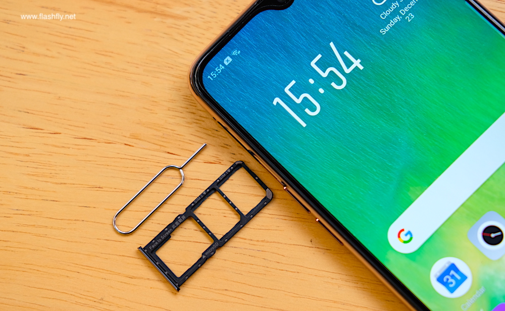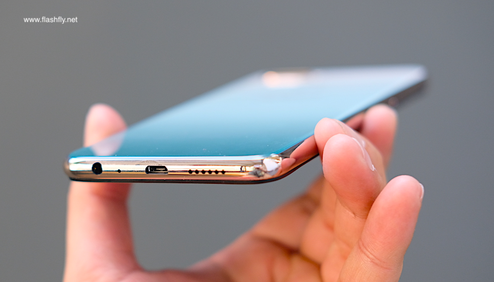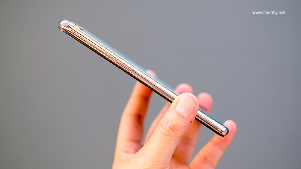 ขอบด้านข้างมีความบาง 7.99 มิลลิเมตร รัดด้วยกรอบสีทอง มาพร้อมถาดใส่การ์ดแบบ 3 ช่อง สำหรับวางซิมการ์ด 2 ช่อง (Dual Nano SIM) และอีกหนึ่งช่องสำหรับใส่การ์ด MicroSD (รองรับความจุสูงสุด 256GB) ถัดลงมาเป็นปุ่มปรับระดับเสียง ส่วนปุ่มเพาเวอร์ติดตั้งไว้อีกข้าง