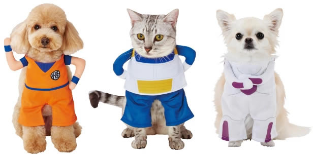 ด้านล่างเป็นชุดคอสซูมที่เหมาะสำหรับงานปาร์ตี้ ประกอบไปด้วยชุดของ Goku, Vegeta และ Frieza สวมใส่ได้ทั้งหมา-แมว ราคา 3,218 เยน หรือราว 945 บาท