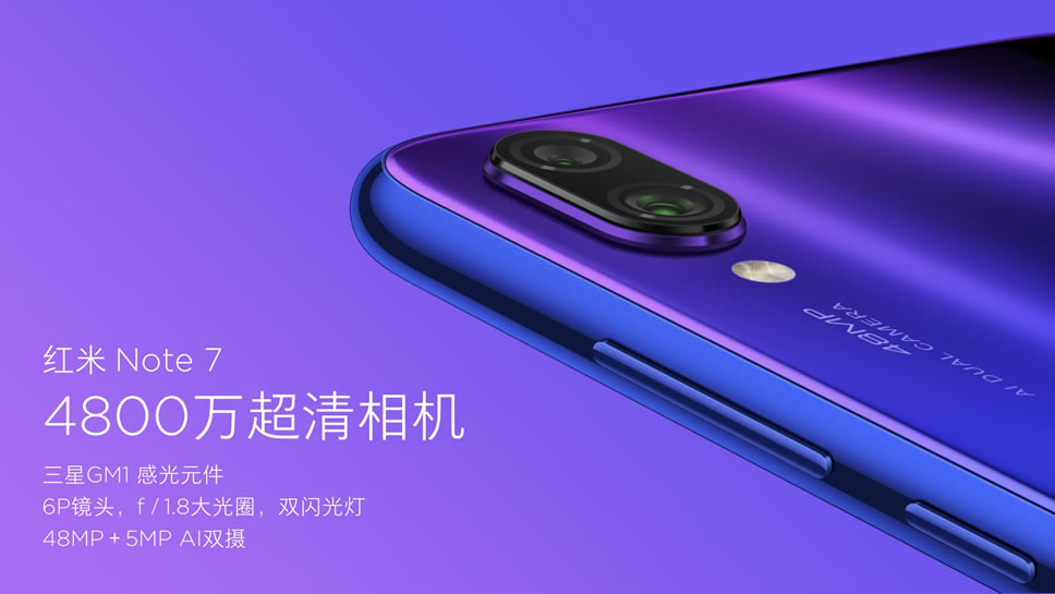 นอกจากดีไซน์สวยหรูแล้ว Redmi Note 7 ยังมีจุดเด่นที่กล้องคู่หลัง ตัวหลัก 48 ล้านพิกเซล (Samsung GM1) รูรับแสง f/1.8 ขนาดพิกเซล 0.8 ไมครอน กล้องตัวรอง 5 ล้านพิกเซล ส่วนกล้องเซลฟี่ 13 ล้านพิกเซล