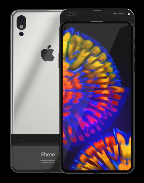 iPhone X2 ของ Antonio ไม่มีรอยบากบนจอแสดงผลอีกต่อไปแล้ว เพราะออกแบบมาให้สไลด์กล้อง Face ID ขึ้นมาได้ คล้ายกับ OPPO Find X หรือ Xiaomi Mi Mix 3