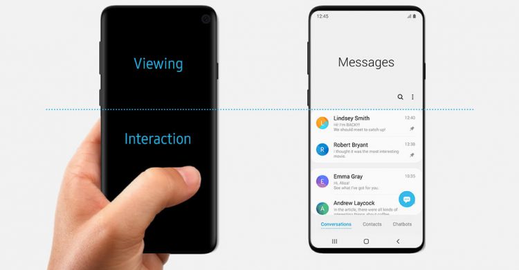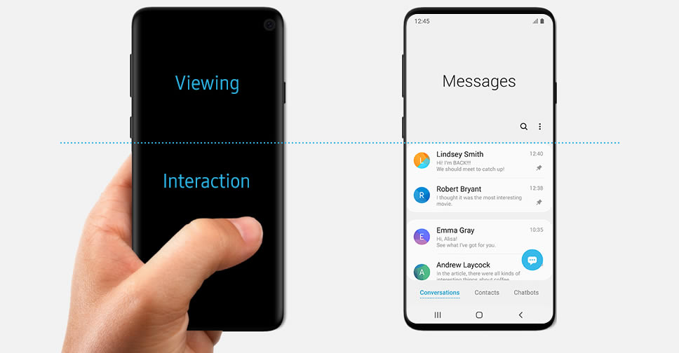 เว็บไซต์ทางการของ Samsung ได้เผยแพร่บทความแนะนำ One UI ซึ่งเป็น User Interface ใหม่ ที่จะนำมาใช้กับสมาร์ทโฟนรุ่นใหม่ๆ เน้นใช้งานสะดวกด้วยมือเพียงข้างเดียว โดยการแบ่งพื้นที่ UI ออกเป็น 2 ส่วนหลักๆ ส่วนบนจะเน้นไปที่การแสดงผล ส่วนล่างจะถูกใช้เป็นพื้นที่โต้ตอบหรือควบคุม