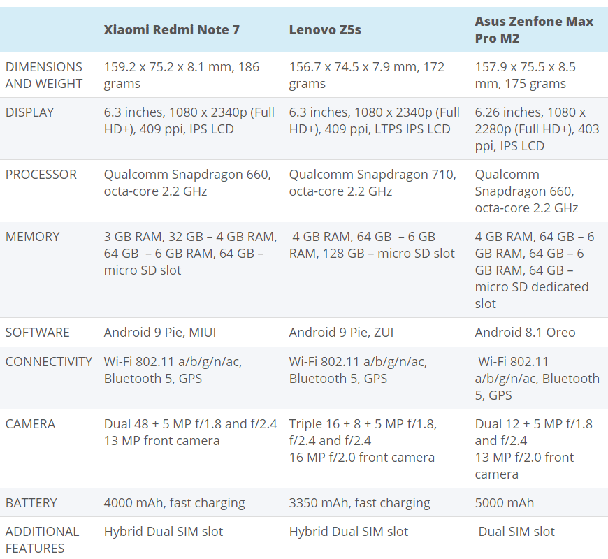 Xiaomi ตัดสินใจแยกแบรนด์ Redmi ให้เป็นอิสระ และได้เปิดตัวสมาร์ทโฟนรุ่นแรกออกมาแล้ว นั่นคือ Redmi Note 7 โดยมีคู่แข่งที่สูสีอย่าง Lenovo Z5s กับ Asus Zenfone Max Pro (M2) แต่ว่ารุ่นไหนจะน่าสนใจมากที่สุด? เว็บไซต์ Gizmochina พยายามหาคำตอบมาให้แล้ว เริ่มจากตารางเปรียบเทียบสเปกด้านล่าง