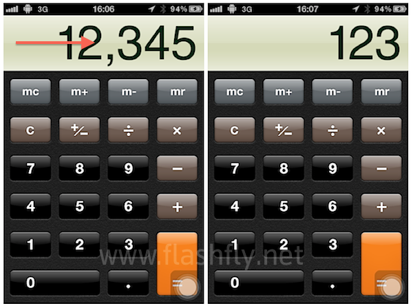 แต่เชื่อหรือไม่ว่าจริงๆแล้ว Apple ได้ซ่อนปุ่ม Back หรือ Delete ไว้อยู่แล้ว สามารถใช้งานได้ทันทีไม่ต้อง Jailbreak เครื่องอีกด้วย “เพียงแค่ใช้นิ้วสัมผัสบริเวณหน้าจอตัวเลขแล้ว เลื่อนนิ้วไปทางซ้ายหรือขวาก็ได้ จะเป็นการลบตัวเลขท้ายสุดที่พิมพ์ไปทีละตัว” ซึ่งวิธีนี้จะช่วยทำให้ใช้งานเครื่องคิดเลขบน iPhone ได้สะดวกยิ่งขึ้น