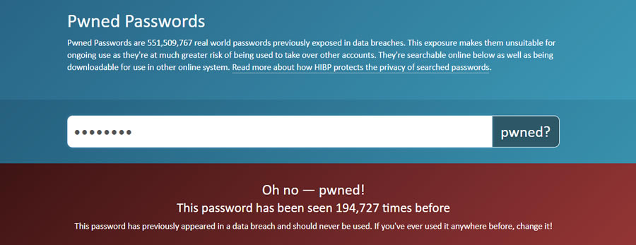 นอกจากนี้ยังสามารถตรวจสอบรหัสผ่านของคุณว่ามีความเสี่ยงถูกแฮกหรือไม่ โดยไปที่ haveibeenpwned.com/Passwords แล้วพิมพ์รหัสผ่านที่ใช้งานเป็นประจำ จากนั้นกดปุ่ม Enter หรือคลิกที่ปุ่ม pwned? ถ้าได้รับข้อความ Oh no — pwned! แนะนำว่าให้รีบเปลี่ยนรหัสผ่านโดยด่วน