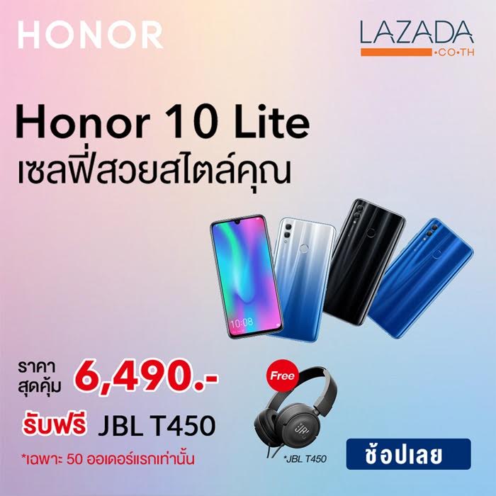 พิเศษสุด! สำหรับลูกค้า 50 คนแรกที่ซื้อ HONOR 10 Lite ผ่านช่องทาง Lazada รับหูฟัง JBL รุ่น T450 ฟรีทันที นอกจากนี้ภายในวันที่ 2 กุมภาพันธ์ ออเนอร์ยังจัดกิจกรรมพิเศษให้แฟนๆและลูกค้าสามารถมาร่วมสนุกลุ้นรับชุดของขวัญสุดพรี่เมี่ยม โดยกิจกรรมจะจัดขึ้นที่ร้านค้า HONOR Shop สาขา MBK ชั้น 5 และ ร้านค้าตัวแทนจำหน่าย CSC สาขาซีคอน บางแค และซีคอน ศรีนครินทร์ ตั้งแต่เวลา 12.00 น. เป็นต้นไป รีบมาร่วมสนุกกันของรางวัลมีจำนวนจำกัด