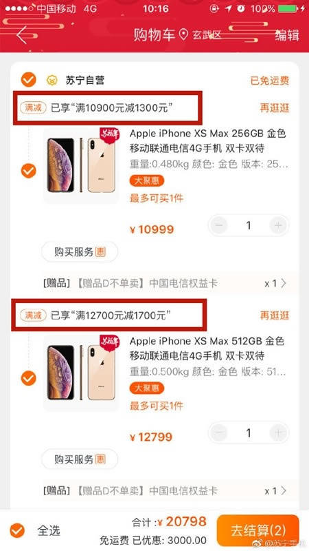 iPhone XS Max รุ่น 512GB จากร้าน Tmall มีราคาอยู่ที่ 11,099 หยวน แต่ราคาใน Apple Store อยู่ที่ 12,799 หยวน ถูกลงกว่าเดิม 1,700 หยวน หรือราว 7,890 บาท ส่วนรุ่น 256GB ร้าน Tmall ก็ขายถูกกว่า 1,300 หยวน หรือราว 6,035 บาท