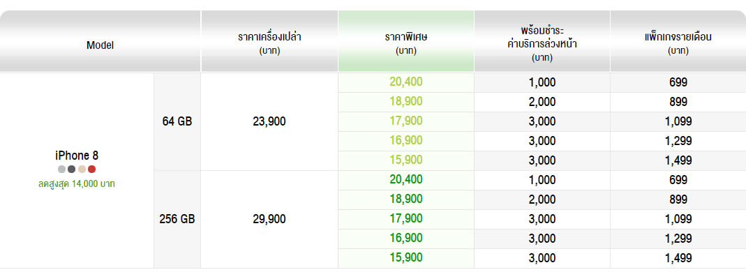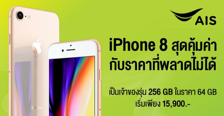 AIS นำเสนอ iPhone 8 รุ่น 256GB ราคาพิเศษ!! เพียง 15,900 บาท (ราคาเท่ากับรุ่น 64GB) ข้อเสนอเดียวกับที่งาน Thailand Mobile Expo 2019 เมื่อซื้อเครื่องพร้อมแพ็กเกจ 4G Hot Deal Max Speed พร้อมชำระค่าบริการล่วงหน้า ตามเงื่อนไขที่บริษัทฯ กำหนด ราคาพิเศษนี้ มีผลตั้งแต่วันนี้ ถึงวันที่ 10 กุมภาพันธ์ 2562 เท่านั้น