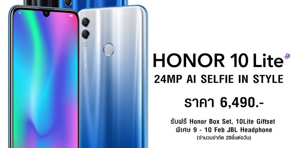- เมื่อซื้อสมาร์ทโฟน HONOR 10 Lite ในราคาเริ่มต้นที่ 6,490 บาท รับฟรีทันที! HONOR Box Set และชุดของขวัญ HONOR 10 Lite Giftset พิเศษสุด! เฉพาะวันที่ 9 -10 กุมภาพันธ์ ลุ้นรับหูฟัง JBL (จำนวนจำกัด 20 ชิ้นต่อวัน)
