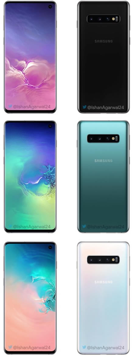 เจ้าของบัญชี Twitter @ishanagarwal24 ปล่อยภาพเรนเดอร์ของสมาร์ทโฟน Samsung Galaxy S10 series ออกมาอีกครั้ง คราวนี้ได้รวบรวมมาให้ครบทุกสี อย่างน้อยก็ในช่วงแรกของการเปิดตัว ทำให้เราเห็นว่า Galaxy S10 กับ Galaxy S10+ จะมีให้เลือก 3 สีเหมือนกัน แต่ Galaxy S10 e จะมีสีเหลืองให้เลือกด้วย