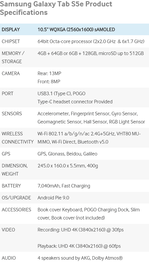 Samsung Galaxy Tab S5e ทำงานบน Android 9.0 Pie ใช้ชิปประมวลผล 64bit Octa-core (2×2.0 GHz + 6×1.7 GHz) ความจำ RAM 4GB จับคู่กับ ROM 64GB หรือ RAM 6GB จับคู่กับ ROM 128GB รองรับการ์ด microSD สูงสุด 512GB กล้องดิจิตอล 13 ล้านพิกเซล กล้องเซลฟี่ 8 ล้านพิกเซล ความจุแบตเตอรี่ 7,040mAh ให้พลังงานนานสูงสุด 14.5 ชั่วโมง รองรับชาร์จเร็วผ่านพอร์ต USB Type C