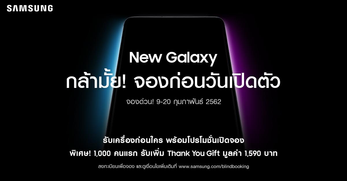 นอกจากนี้แคมเปญ“New Galaxy กล้ามั้ย จองก่อนวันเปิดตัว” ยังเปรียบเสมือนการขอบคุณแฟน ๆ กาแลคซี่ที่ให้การสนับสนุนอย่างเหนียวแน่น โดยซัมซุงเตรียมมอบสิทธิพิเศษเหนือกว่าถึง 3 ต่อ! ต่อที่1 รับ New Galaxy รุ่นใหม่ล่าสุดก่อนใครในวันที่ 25 ก.พ. นี้ ต่อที่ 2 มีสิทธิ์ร่วมรับโปรโมชั่นหลังการเปิดตัว มูลค่าสูงสุดกว่า 10,000 บาท และพิเศษ! ต่อที่ 3 สำหรับ 1,000 คนแรกที่จองและมารับเครื่อง รับเพิ่มของขวัญ Thank you Gift มูลค่า 1,590 บาท สามารถลงทะเบียนจองไม่มีค่าใช้จ่ายได้แล้ววันนี้ ทางเว็บไซต์ www.samsung.com/th/blindbooking ด่วน! ก่อนหมดเขตวันที่ 20กุมภาพันธ์นี้