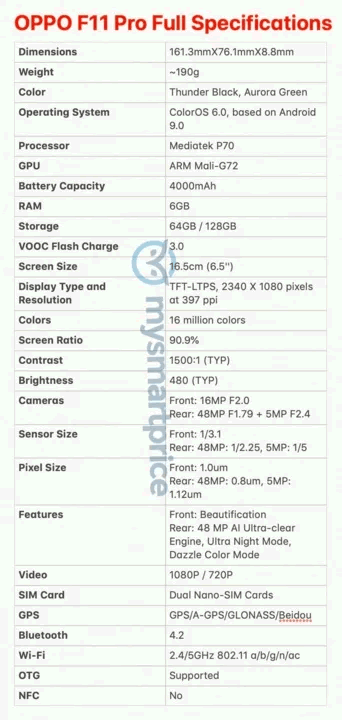 แต่ล่าสุดมีสเปกอย่างเต็มรูปแบบของ OPPO F11 Pro รั่วไหลออกมาแล้ว ตามรูปภาพด้านล่าง เพราะฉะนั้น ที่เหลือก็เพียงรอดูว่า OPPO จะแขวนป้ายราคาไว้ที่เท่าไร ซึ่งเราจะได้ทราบกันอย่างแน่นอน ในวันที่ 5 มีนาคมนี้