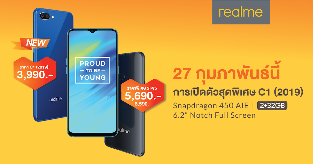 realme C1 (2019) เป็นสมาร์ทโฟนที่คุ้มค่า ทั้งสเปคและราคา พร้อมกับความจุที่เพิ่มมากขึ้นเพื่อตอบโจทย์คนรุ่นใหม่หลังจากได้รับการเรียกร้องให้นำเข้า realme C1 (2019) กับการถูกขนานนามให้เป็นม้ามืดในตลาดสมาร์ทโฟนที่คุ้มค่า ในครั้งนี้จะมีการจัดจำหน่าย realme C1 (2019)พร้อมความจุRAM 2 GB ROM 32 GB ด้วยคุณสมบัติจัดเต็ม แบตเตอรี่จุใจขนาดใหญ่ถึง 4230 มิลลิแอมป์ใช้งานได้นานตลอดทั้งวัน พร้อมกับหน้าจอที่มีขนาดใหญ่6.2 นิ้ว ช่วยให้ดูหนังฟังเพลง จุใจอย่างแน่นอน นอกจากนี้ยังทรงพลังด้วย Snapdragon 450 และกล้องหน้าที่มีระบบ AI ช่วยให้ภาพเซลฟี่สวยงามตามต้องการ มาในราคาที่คุ้มค่าเพียง 3,990 บาท