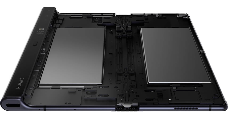 วิธีการพับของ Huawei Mate X จะพับออกด้านนอก ซึ่งตรงกันข้ามกับ Samsung Galaxy Fold ที่พับเข้าด้านใน นั่นหมายถึง Mate X จะมีจอแสดงผลทั้งด้านหน้าและด้านหลังเมื่อถูกพับ และเมื่อใช้งานในรูปแบบแท็บเล็ต ก็สามารถแสดงแอพพลิเคชั่นหลายแอพแบบแยกหน้าต่างได้